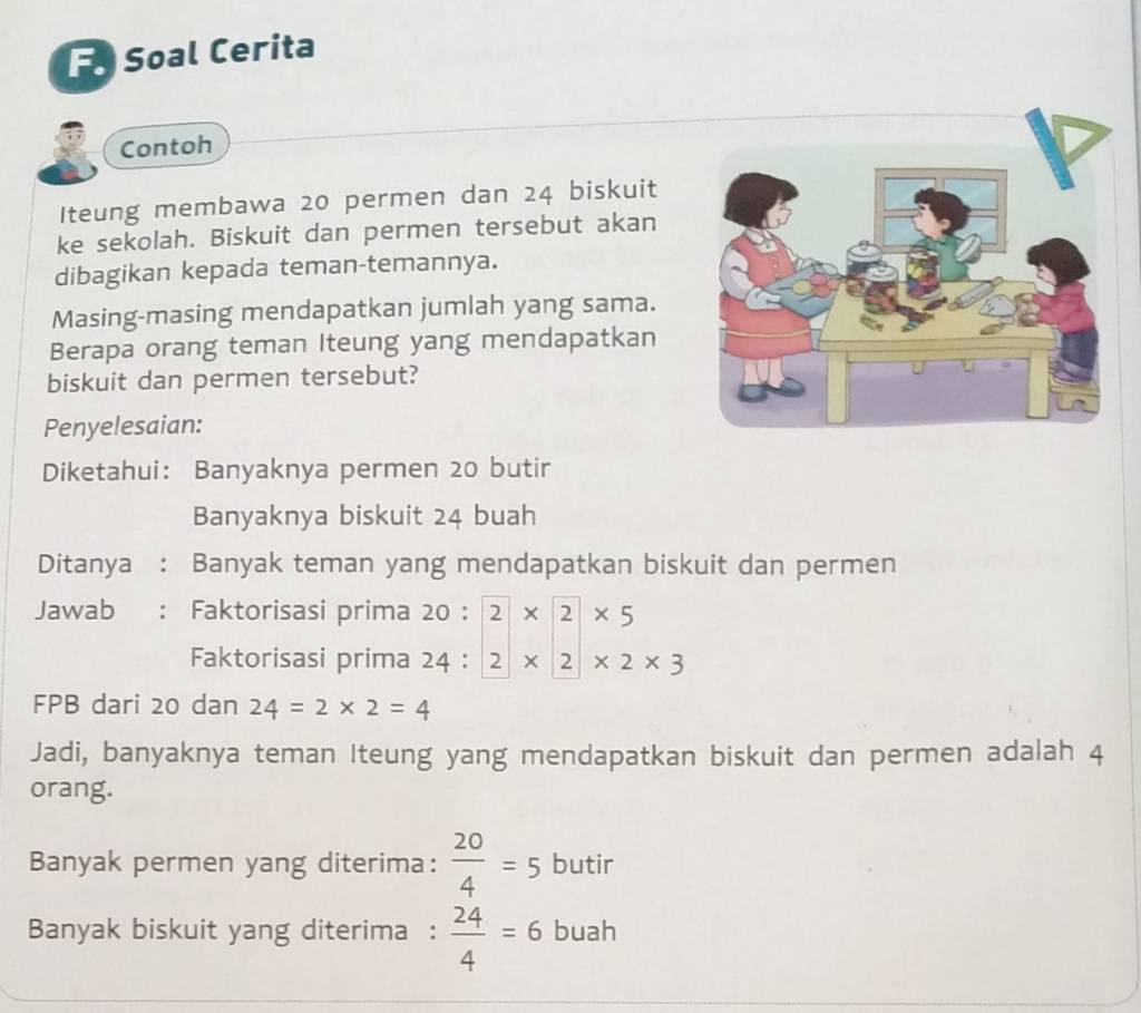 - Dika mempunyai 12 pensil dan 20 buku. Ia ingin memberikan semua pensil dan buku tersebut kepada nak-anak kurang mampu. setiap anak menerima pensil dan buku dengan jumlah yang sama. Berapa anak paling banyak yang akan menerima pemberian Dika? Berapa pensil dan buku yang diterima masing-masing anak?